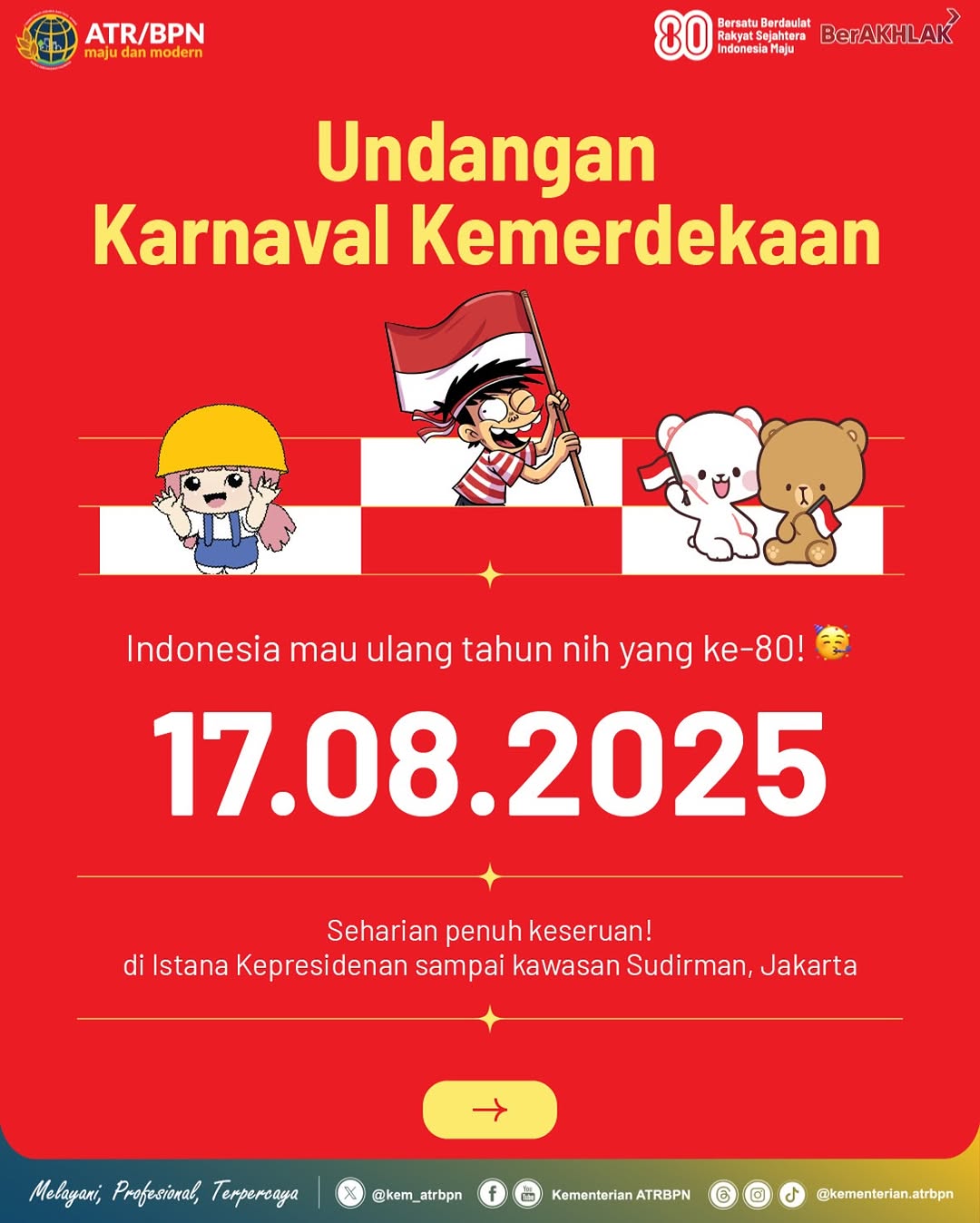 Banggaitoday.com – Halo #SobATRBPN, jangan lewatkan perayaan puncak Hari Ulang Tahun ke-80 Republik Indonesia yang akan digelar di Jakarta, yaa