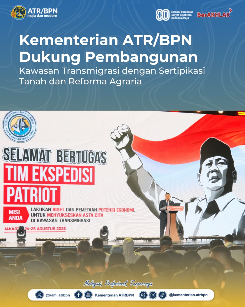 Jakarta, Banggaitoday.com – Kementerian Agraria dan Tata Ruang/Badan Pertanahan Nasional (ATR/BPN) ikut mendukung pertumbuhan pembangunan dan ekonomi di kawasan transmigrasi sesuai dengan visi misi Asta Cita melalui beberapa program strategis bersama Kementerian Transmigrasi. Hal ini disampaikan oleh Wakil Menteri (Wamen) ATR/Wakil Kepala (Waka) BPN, Ossy Dermawan, saat menyampaikan materi dalam Pembekalan dan Pelepasan Tim Ekspedisi Patriot, di Balai Kartini, Jakarta, Senin (25/08/2025).