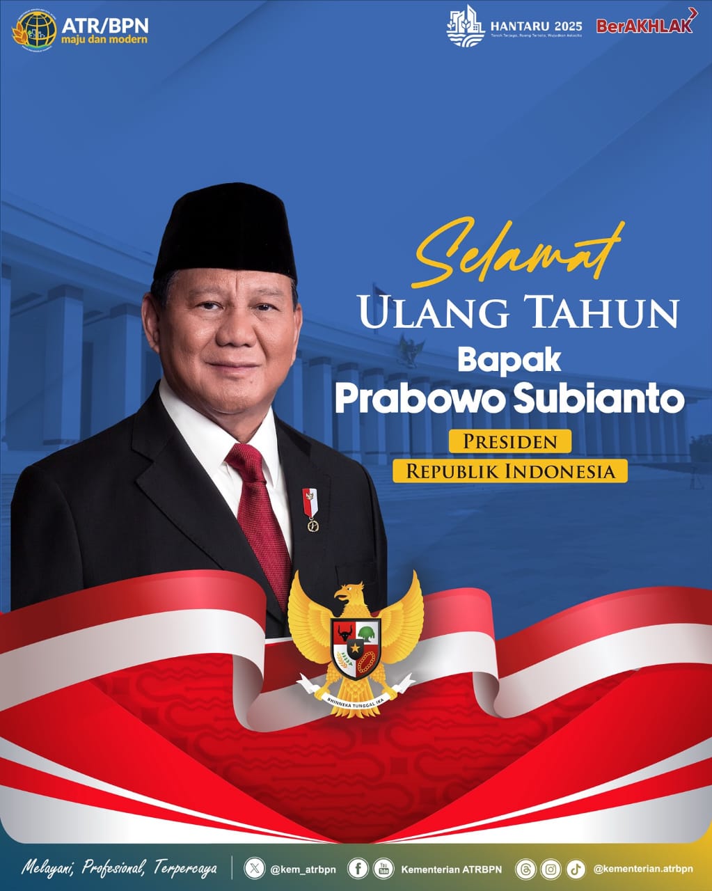 Banggaitoday.com – Segenap keluarga besar Kementerian ATR/BPN mengucapkan Selamat Ulang Tahun ke-74, Bapak Prabowo Subianto Presiden Republik Indonesia.