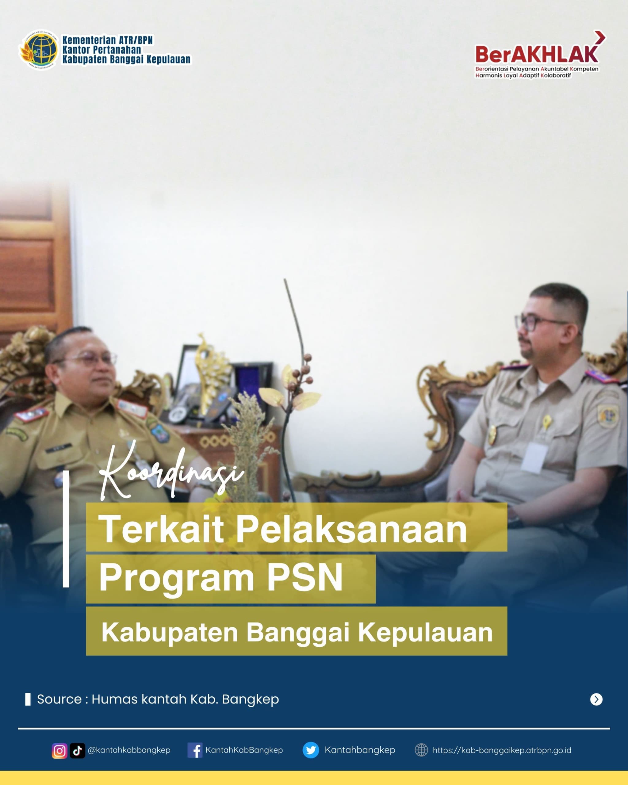 Kepala Kantor Pertanahan Kabupaten Banggai Kepulauan, Dr. Dito Syaferly, S.H., M.Kn., melaksanakan kegiatan koordinasi ke Kantor Sekretariat Daerah Kabupaten Banggai Kepulauan terkait pelaksanaan Program Strategis Nasional (PSN) di Kabupaten Banggai Kepulauan.