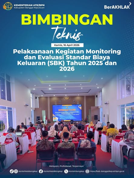 BANGKEP, Banggaitoday.com – Kamis, 16 April 2026, Kantor Pertanahan Kabupaten Banggai Kepulauan mengikuti kegiatan Bimbingan Teknis Pelaksanaan Monitoring dan Evaluasi Standar Biaya Keluaran (SBK) Tahun 2025 dan 2026 yang diselenggarakan di Aula Kalode Kantor Wilayah BPN Provinsi Sulawesi Tengah.