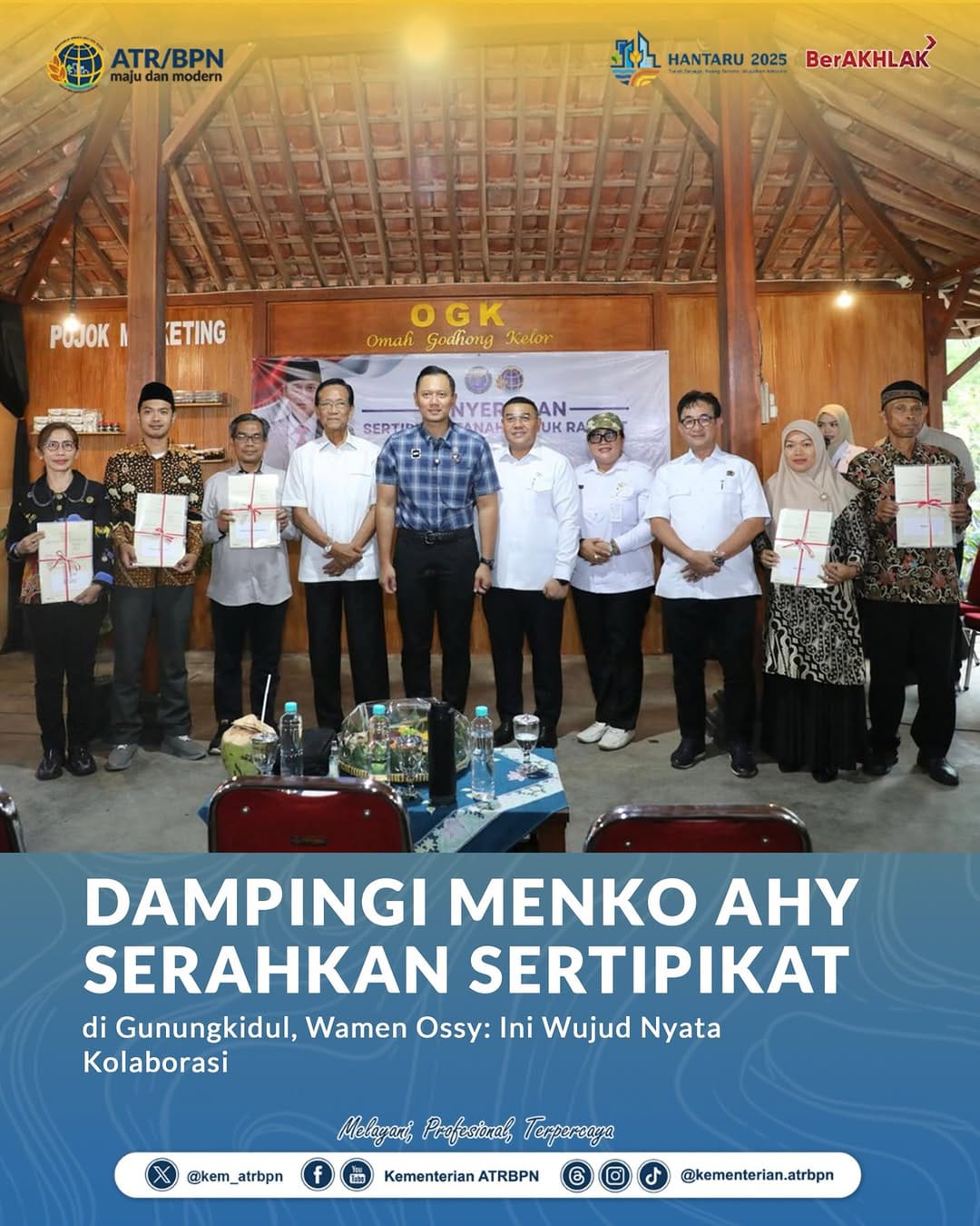 “Penyerahan sertipikat ini menjadi wujud nyata kolaborasi antara pemerintah pusat, daerah, dan masyarakat, dalam memperkuat kepastian hukum atas tanah,” ungkap Wamen Ossy saat mendampingi Menteri Koordinator Bidang Infrastruktur dan Pembangunan Kewilayahan (Menko IPK), Agus Harimurti Yudhoyono (AHY), dalam penyerahan sertipikat di Desa Kelor, Kabupaten Gunungkidul.
