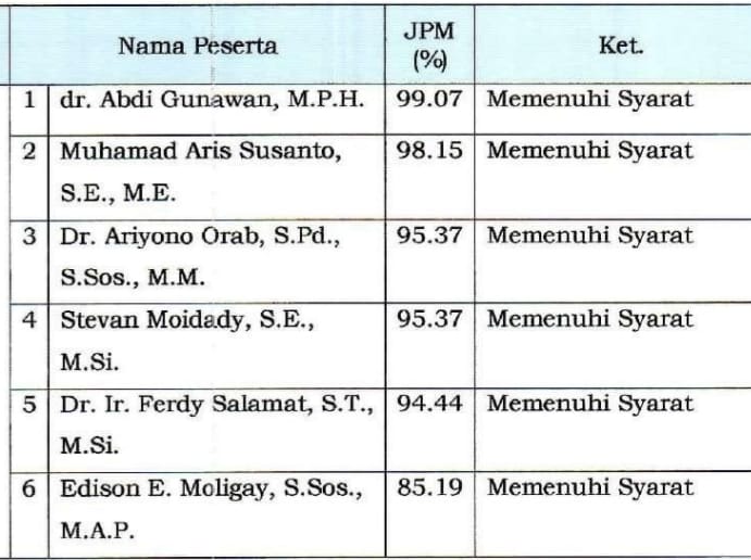 Dua peserta lainnya lagi yakni, DR. Aryono Orab, S.pd,.S.sos,. MM dan Stevan Moidady, SE,.M.Si mengantongi nilai sama dengan capaian angka kumulatif sebesar 95,37 persen.