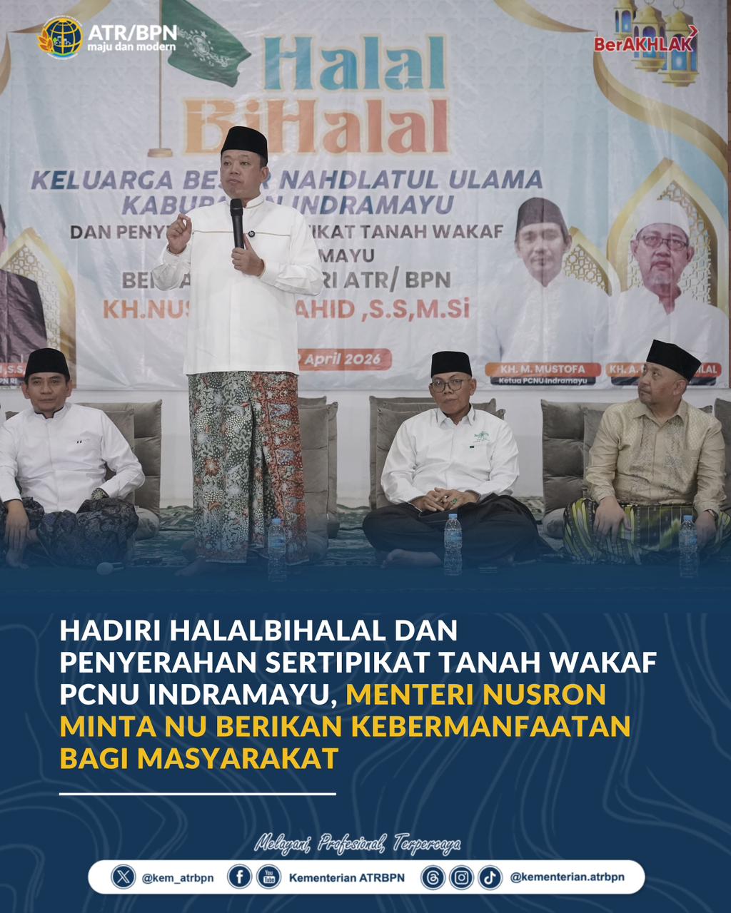 Indramayu, Banggaitoday.com – Menteri Agraria dan Tata Ruang/Kepala Badan Pertanahan Nasional (ATR/BPN), Nusron Wahid, mengajak Nahdlatul Ulama (NU) ikut berperan menyebarkan manfaat nyata bagi masyarakat. Pesan itu ia sampaikan langsung kepada anggota yang hadir dalam Halalbihalal dan Penyerahan Sertipikat Tanah Wakaf Pengurus Cabang Nahdlatul Ulama (PCNU) Indramayu, Minggu (19/04/2026).