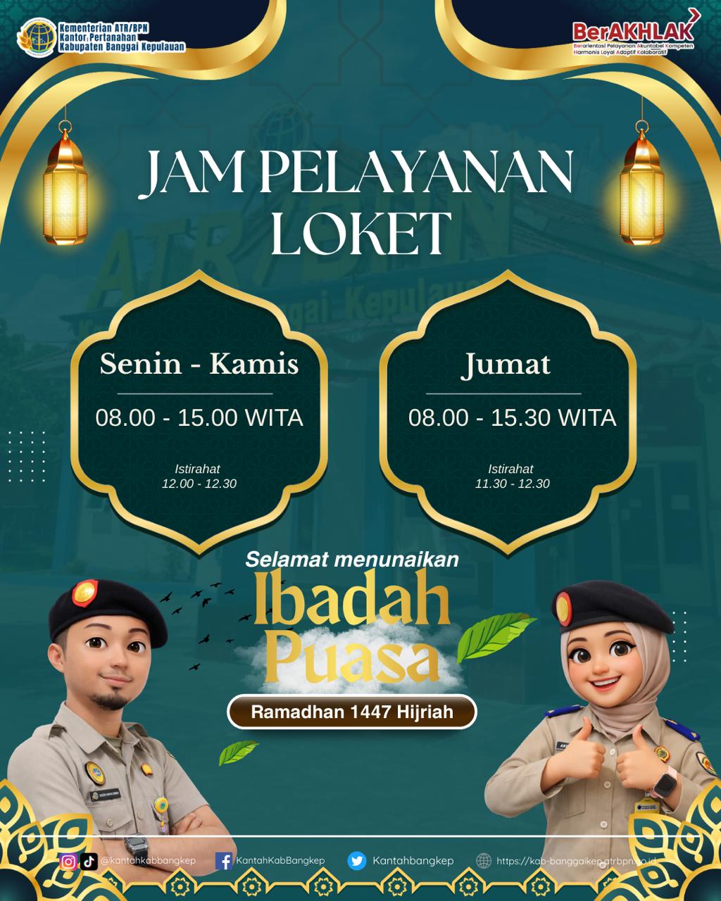 BANGKEP, Banggaitoday.com – Dalam rangka menyesuaikan jam kerja selama Bulan Suci Ramadhan, dengan ini disampaikan bahwa jam pelayanan loket pada Kantor Pertanahan Kabupaten Banggai Kepulauan adalah sebagai berikut: