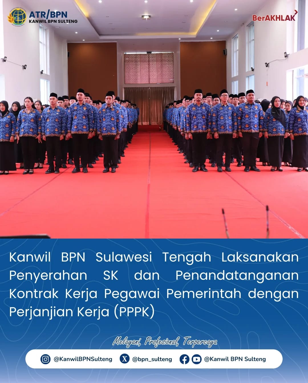 Kantor Wilayah Badan Pertanahan Nasional (BPN) Provinsi Sulawesi Tengah melaksanakan kegiatan penyerahan Petikan Surat Keputusan (SK) dan penandatanganan kontrak kerja kepada seluruh Pegawai Pemerintah dengan Perjanjian Kerja (PPPK) di lingkungan Kanwil BPN dan Kantor Pertanahan se-Sulawesi Tengah.
