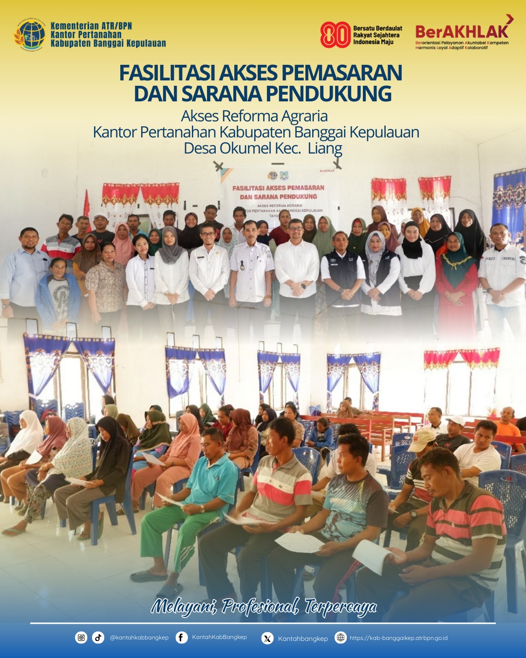 Turut hadir dalam kegiatan ini, Dito Syaferli selaku Kepala Kantor Pertanahan Kab. Banggai Kepulauan, Mohammad Yasir selaku Plt. Kepala Seksi Penataan dan Pemberdayaan beserta staf, Surianto U. Abbas selaku Kepala Desa Okumel, Edy Nashry selaku Koordinator Penyuluh Perikanan, Nurhidayati H. Lasida selaku Penyuluh Perikanan, dan Field Staff Kantor Pertanahan Kab. Banggai Kepulauan.