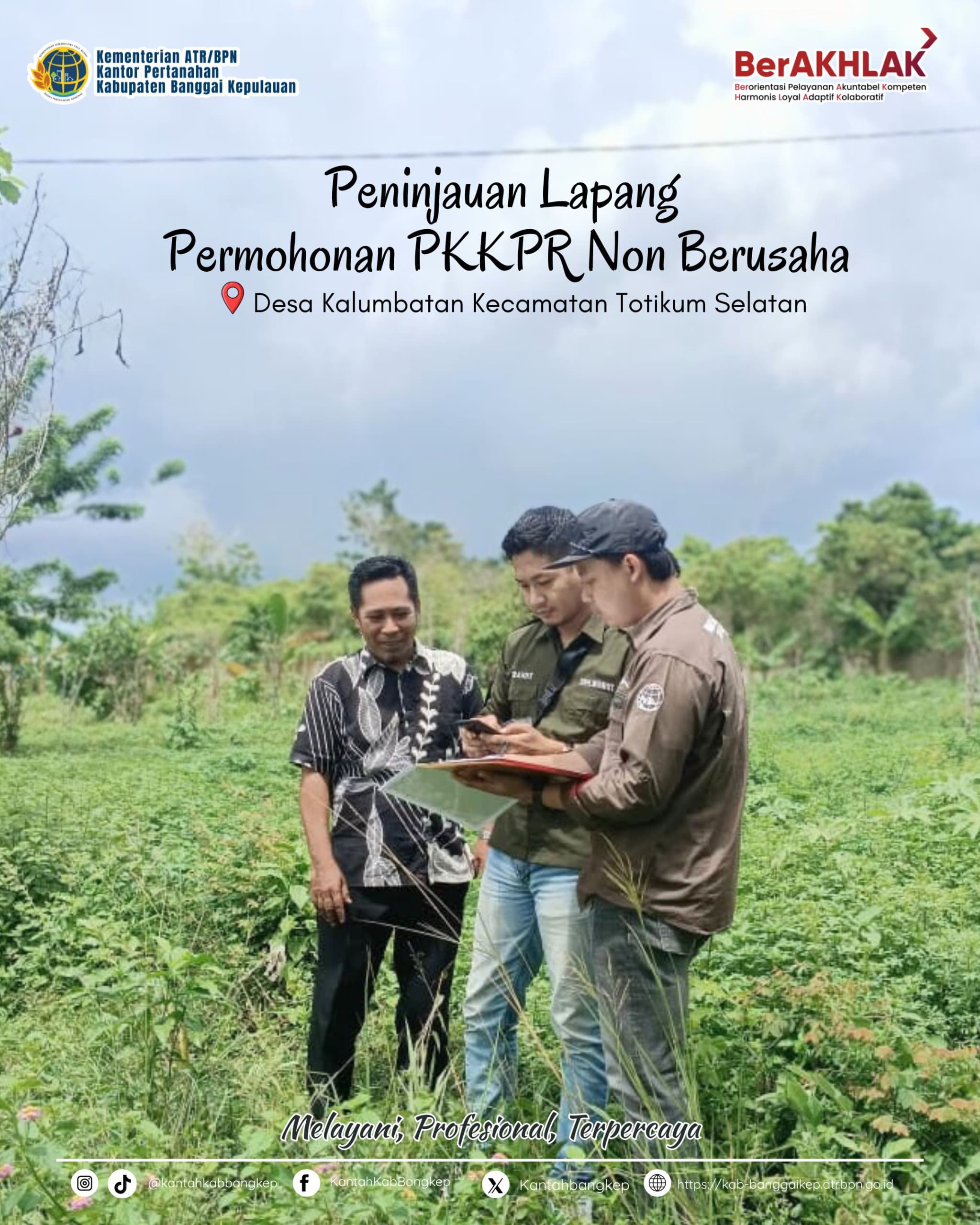 Bangkep, Banggaitoday.com – Kantor pertanahan Kabupaten Banggai Kepulauan telah melaksanakan Peninjauan lapangan permohonan PKKPR Non berusaha yang dilaksanakan oleh Frandy Anggryawan selaku kepala seksi penataan dan pemberdayaan, Achmad Sulareza Amilucky selaku kepala seksi pengadaan tanah dan pengembangan serta Zahratun Firdaus selaku kepala seksi pengendalian dan penanganan sengketa beserta Tim yang dilakukan peninjauan di Desa Kalumbatan Kecamatan Totikum Selatan.
