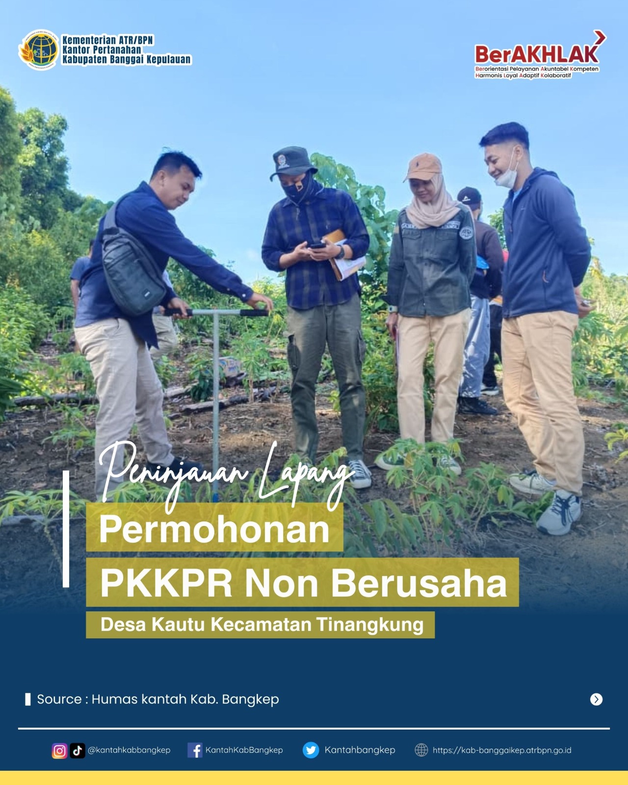 Kantor Pertanahan Kabupaten Banggai Kepulauan melaksanakan kegiatan peninjauan lapang dalam rangka menindaklanjuti Permohonan Persetujuan Kesesuaian Kegiatan Pemanfaatan Ruang (PKKPR) Non Berusaha yang berlokasi di Desa Kautu, Kecamatan Tinangkung.