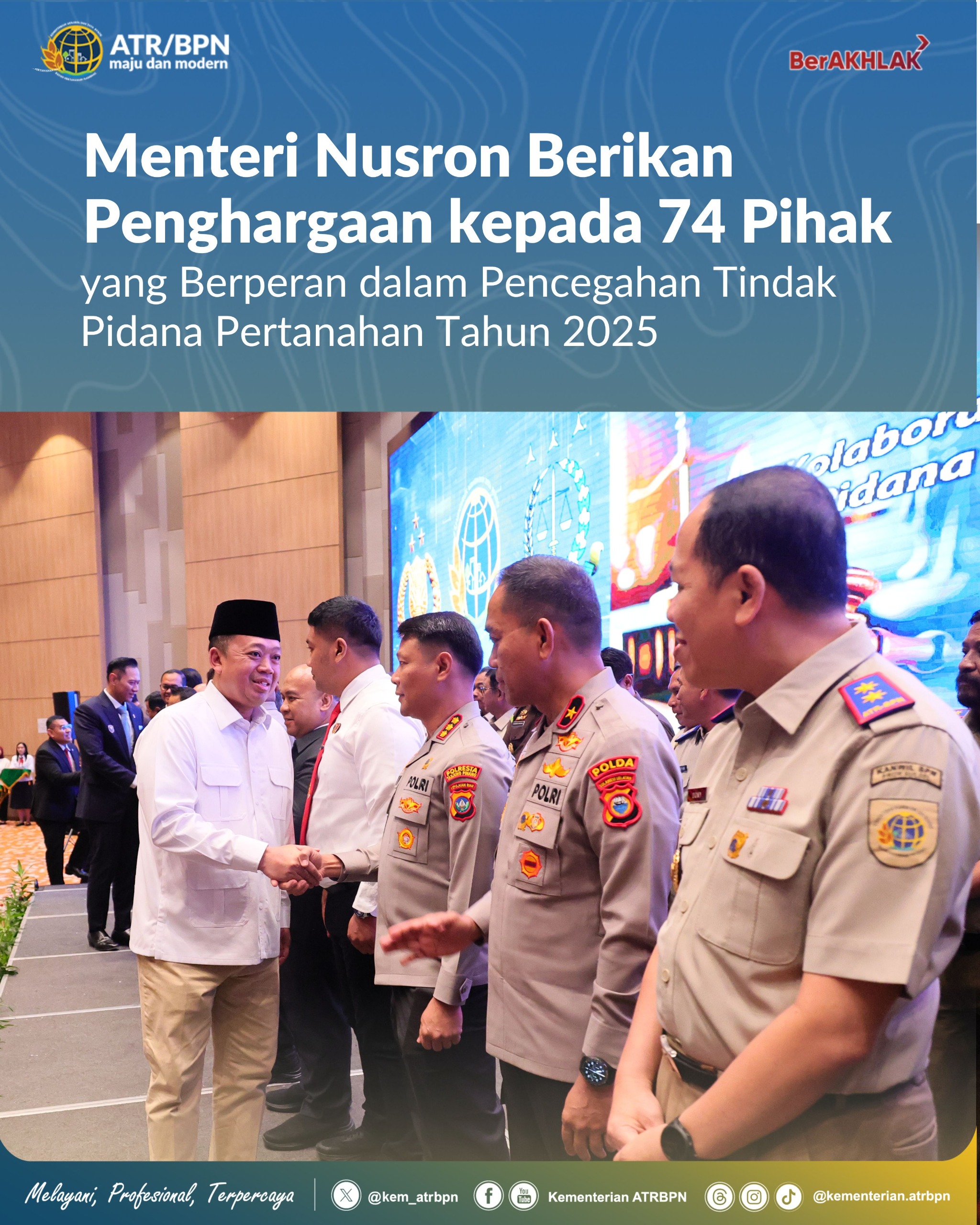 Dalam kesempatan ini Menteri Nusron didampingi Wakil Menteri Agraria/Wakil Kepala BPN, Ossy Dermawan; Direktur Jenderal Penanganan Sengketa dan Konflik Pertanahan, Iljas Tedjo Prijono; dan Ketua Satgas Anti-Mafia Tanah yang juga selaku Direktur Pencegahan dan Penanganan Konflik Pertanahan, Hendra Gunawan menyaksikan penyematan pin dan pemberian penghargaan kepada 74 orang yang mendapatkan apresiasi.