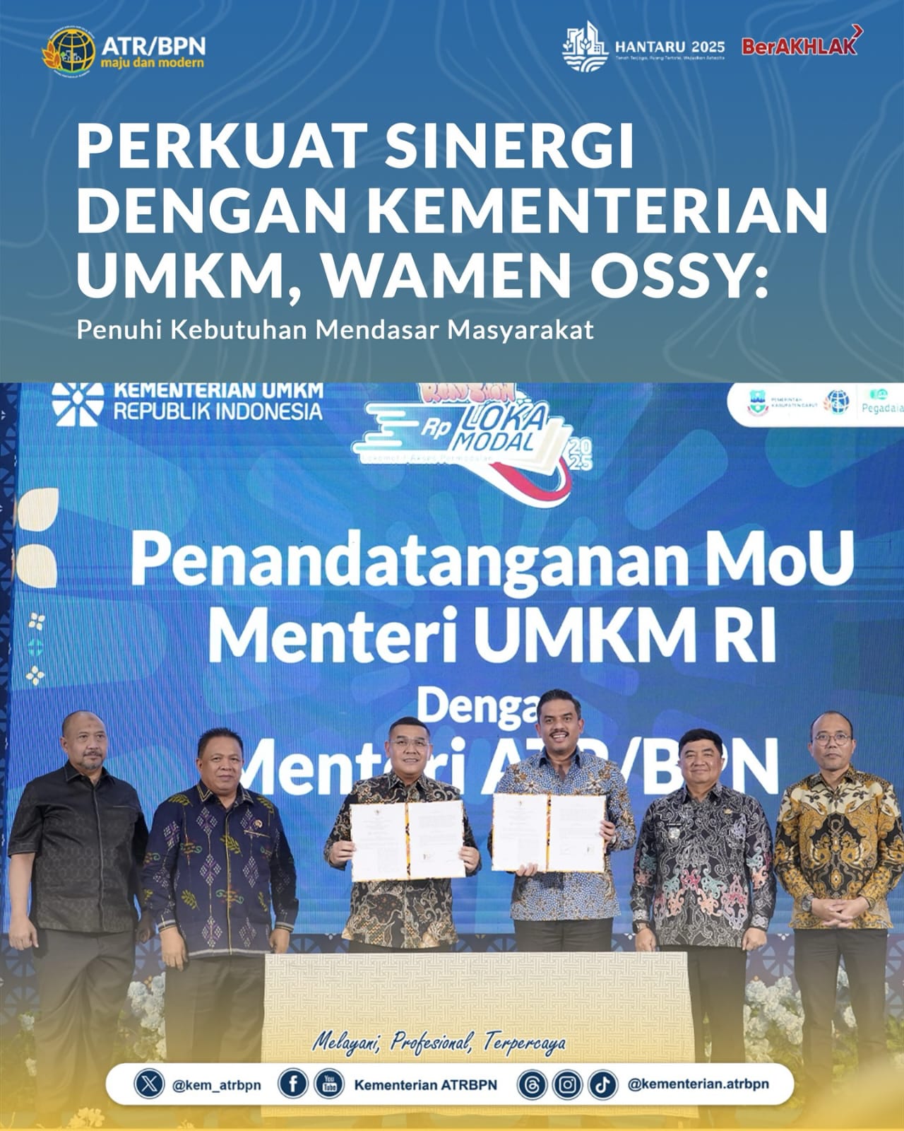 Banggaitoday.com – Kementerian Agraria dan Tata Ruang/Badan Pertanahan Nasional (ATR/BPN) memperkuat sinergi lintas sektor yang kali ini ditandai dengan penandatanganan Nota Kesepahaman antara Kementerian ATR/BPN dan Kementerian UMKM, Kamis (25/09/2025). Kerja sama ini menghubungkan dua kebutuhan mendasar masyarakat, yaitu kepastian hukum atas tanah dan akses permodalan untuk mengembangkan usaha.