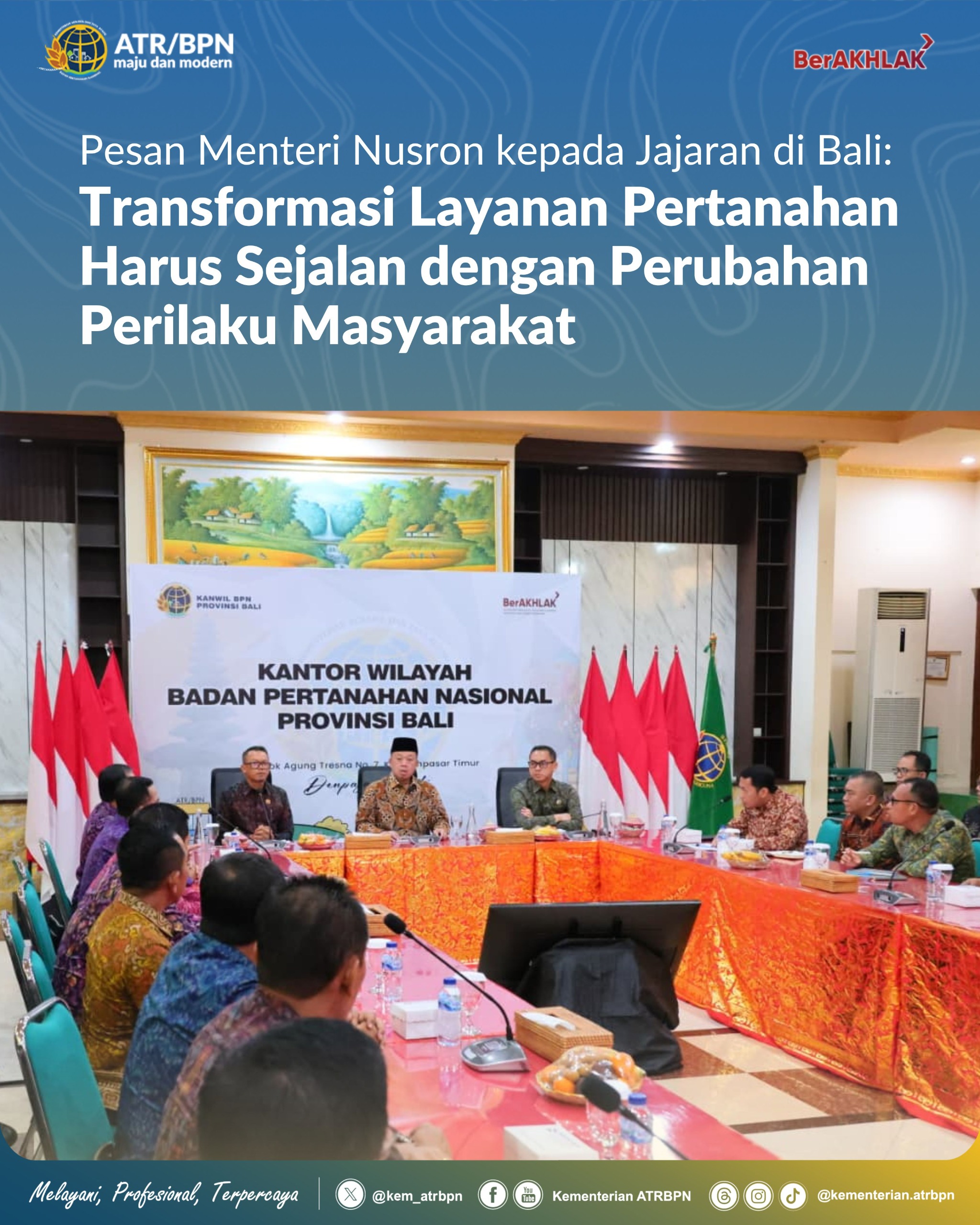 Dengan penataan sistem dan SDM, ia berharap jajaran Kanwil BPN Provinsi Bali dapat memberikan pelayanan pertanahan yang cepat, bersih, transparan, dan sesuai ekspektasi masyarakat masa kini. “Perubahan perilaku masyarakat itu nyata. Karena itu, transformasi layanan harus dilakukan, bukan hanya untuk menjawab kebutuhan publik, tetapi juga agar institusi kita tetap relevan,” pungkas Menteri Nusron.