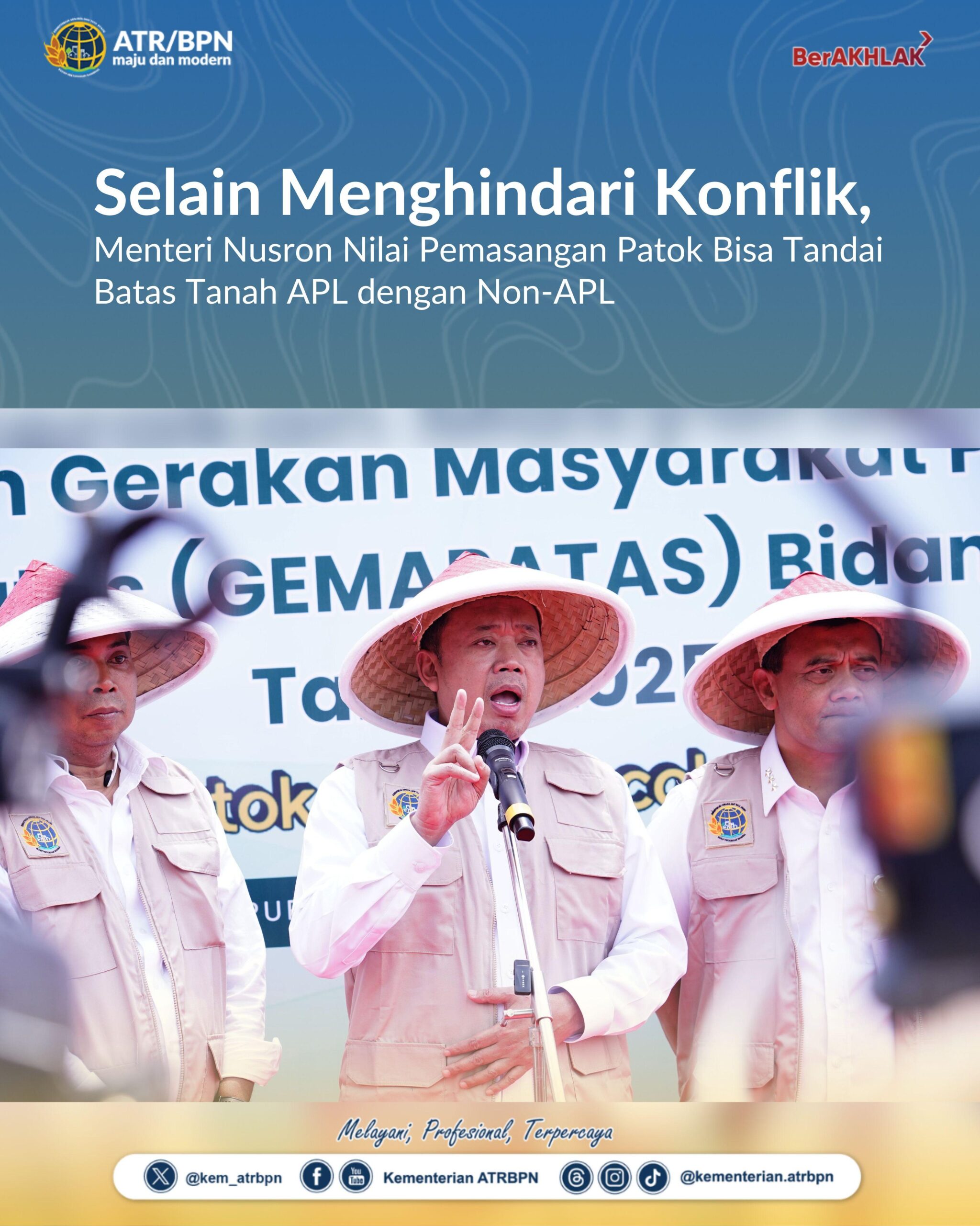 “Salah satu program kita hari ini, yaitu pemasangan patok tanda batas, sangat penting. Selain untuk menandai batas bidang tanah masing-masing, juga bertujuan untuk membedakan mana batas kawasan hutan dan mana yang termasuk Areal Penggunaan Lain (APL) atau non-hutan,” ujar Menteri Nusron dalam sambutannya pada kegiatan Pencanangan Gerakan Masyarakat Pemasangan Tanda Batas (GEMAPATAS) di Purworejo, Jawa Tengah, Kamis (07/08/2025).