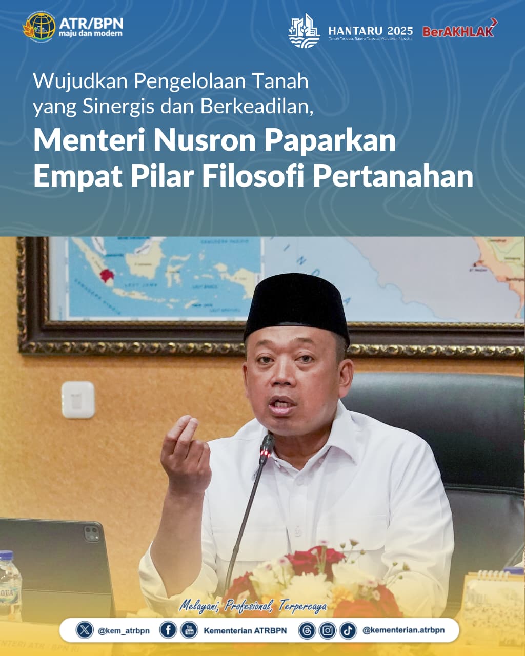 Ia menjelaskan, ada empat pilar utama dalam filosofi pertanahan, yaitu _land tenure, land value, land use,_ dan _land development_. Pertama, _land tenure_, ini berkaitan dengan keabsahan dan legalisasi tanah. Menurutnya, persoalan ini tidak hanya menjadi tanggung jawab ATR/BPN semata, tetapi juga memerlukan peran aktif pemerintah daerah hingga tingkat desa.